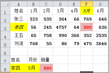 再查找“五月”所在的行位置:=MATCH(B8,B$1:G$1,0)
