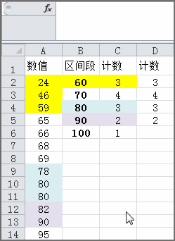 =FREQUENCY(A1:A50,{60;70;80;90}) 或